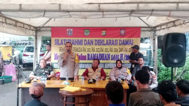 JAKARTA – Lurah Cipinang Besar Utara Agung Budi Santoso dan Kapolres Metro Jakarta Timur Kombes Pol Nicolas Ary Lilipaly menghadiri acara silaturahmi dan deklarasi damai.