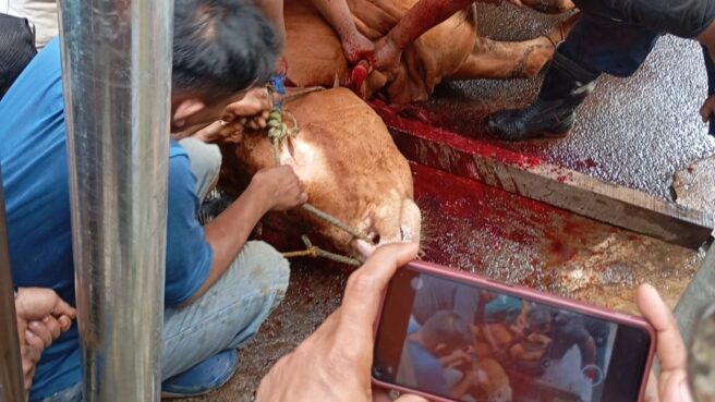 JAKARTA – Warga TPU Prumpung RT 011 RW 03, Jatinegara, Jakarta Timur melaksanakan penyembelihan hewan kurban di Mushola Al-Mubarok.